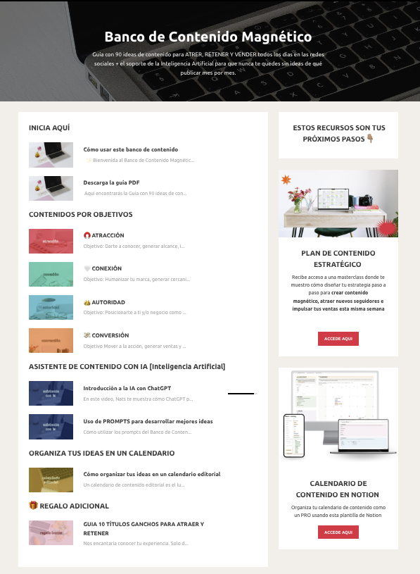 Con la Guía 90 IDEAS DE CONTENIDO, tendrás un sistema claro y adaptable para planificar hasta 3 meses (o más) de contenido con propósito potenciada con inteligencia artificial.
